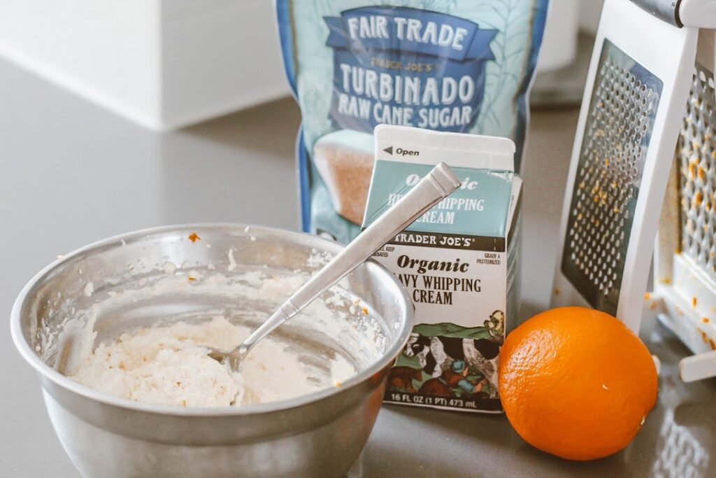 - In a mixer or medium metal bowl add whipping cream, sugar, vanilla extract, and orange zest. Whip ingredients for 3 minutes or until mixture becomes thick and stiff.