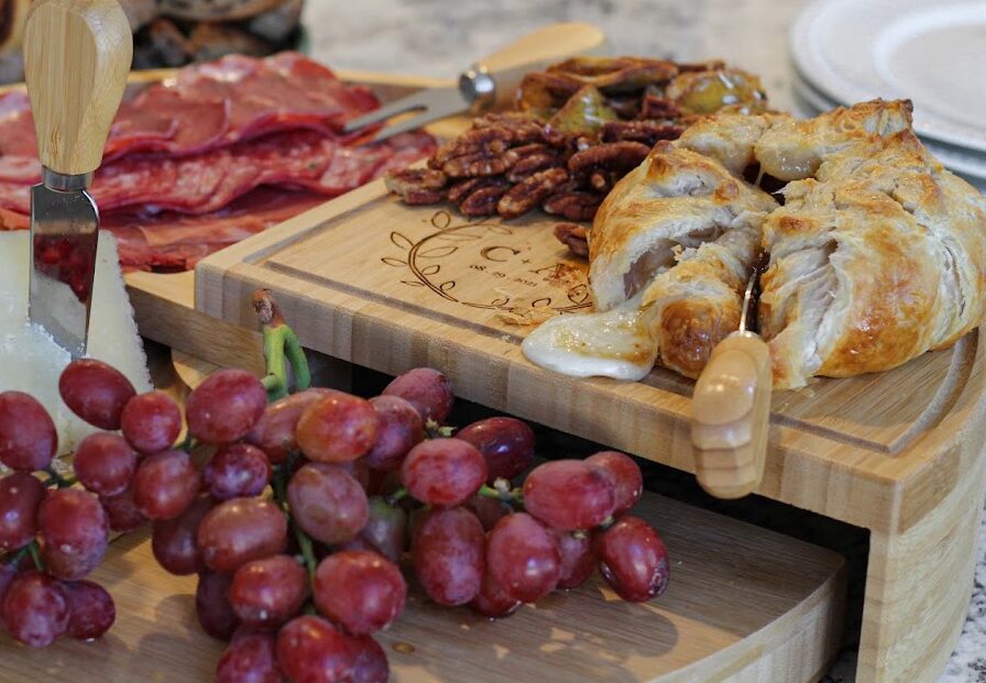 This is perfect addition to boost your basic charcuterie board to a new level! It does take a little time to bake in the oven so be sure to plan ahead with time so that you can serve the baked brie while it’s still warm and gooey.